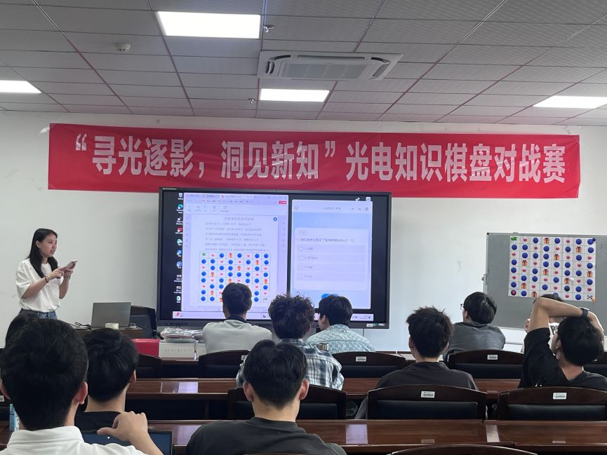 5月10日上午,中国光学学会福建师范大学光电与信息工程学院科普教育基地于福建师范大学科研楼18号楼405会议室开展了以“寻光逐影,洞见新知”为主题的光电知识棋盘对战赛活动,本次活动由福建师范大学信息光子学研究中心、中国光学学会福建师范大学光电与信息工程学院科普教育基地和福建省光学学会等联合主办,由国际光学与光子学会(SPIE)福建师范大学学生分会、美国光学学会(Optica)福建师范大学学生分会、中国光学学会(COS)福建师范大学学生分会、中国光学工程学会(CSOE)福建师范大学学生分会承办,活动邀请到了光电与信息工程学院辅导员黄镇城老师,多位在校研究生、本科生参与本次复赛及学术交流活动。