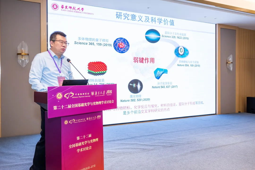 刘辉主持会议邀请中科院院士、中国科学院物理研究所金奎娟研究员作题为“光与低维氧化物相互作用研究”大会报告。南京大学王振林教授,上海科学院院长孙真荣教授,北京大学许秀来教授分别做“超构表面相位调控与多功能光学器件”、“弱作用分子团簇高时空分辨精密测量和调控”和“激子与微腔的相互作用”的大会邀请报告。