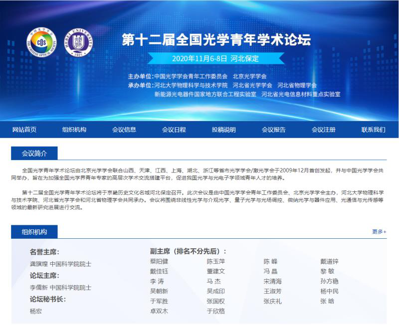 第十二届全国光学青年学术论坛将于2020年11月6日至8日在河北保定召开。此次会议由中国光学学会青年工作委员会、北京光学学会主办,河北大学物理科学与技术学院、河北省光学学会、河北省物理学会、新能源光电器件国家地方联合工程实验室和河北省光电信息材料重点实验室共同承办。论坛议题涵盖非线性光学与介观光学、量子光学与光场调控、微纳光学与器件应用、光通信与光传感、能源光电子学、固体发光与显示技术等领域。