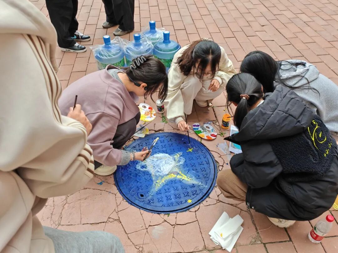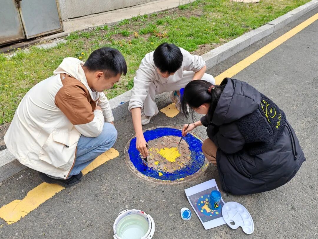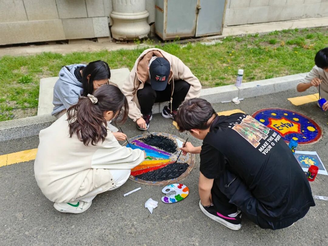 4月30日, 学生分会的各位成员将校园井盖打造成“光学知识展板”。“光子能量方程”、“三棱镜分光”、“光与星空”跃然“盖”上,冷硬的井盖在画笔下焕发新生,科学与艺术的边界在此消融,成员们将抽象知识转化为创意涂鸦,用艺术诠释科学之美,此刻的校园小径宛如一条“光学走廊”,每一步都踩着科学与想象力的火花。