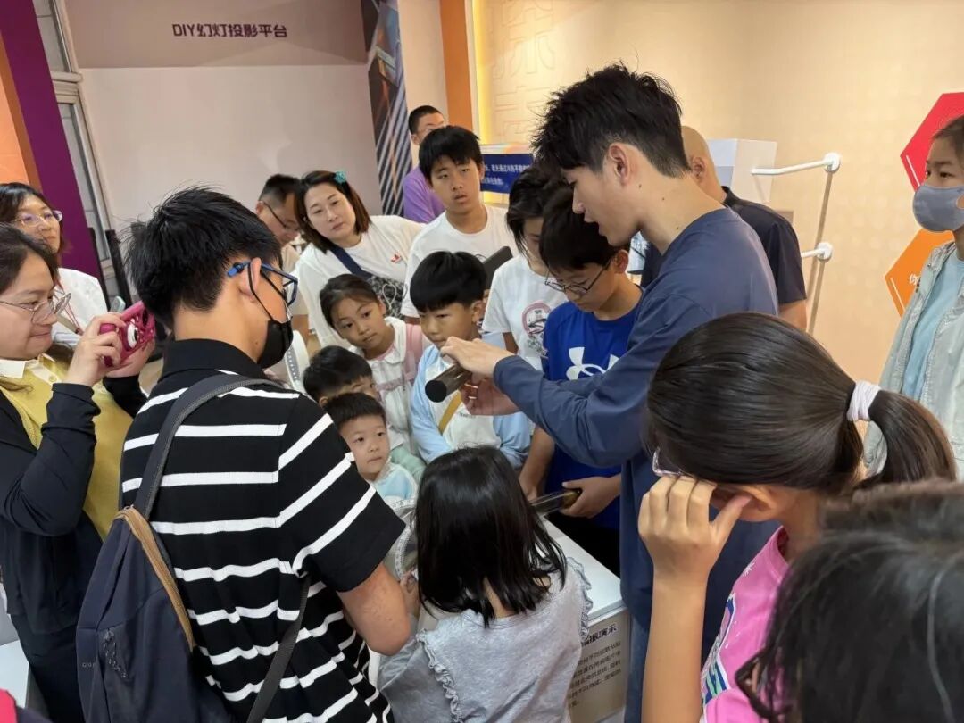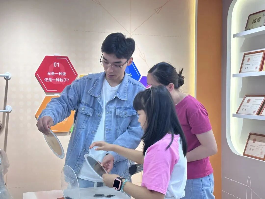 最让孩子们欢呼雀跃、大人们也兴致盎然的,当属光学互动小实验区域。“消失的硬币” 让硬币在神奇的光学原理下 “隐身”;“无限延伸的隧道” 利用光学反射,营造出梦幻般的视觉效果;“近视与远视模型” 生动直观地展示了视力问题的成因;“偏振片显像” 则让大家亲眼见证光的偏振特性带来的奇妙变化。通过这些有趣的实验,大家亲手触摸光学,零距离感受光学的奥秘,一颗颗热爱光学的种子也在体验中悄然种下。