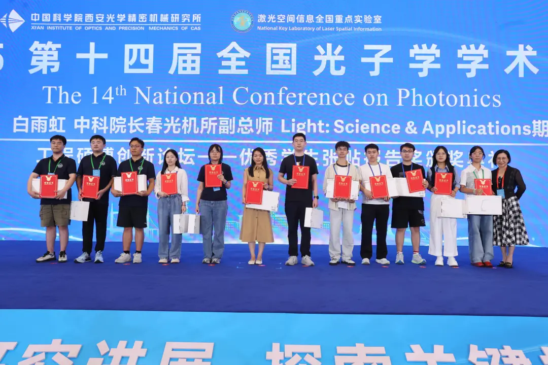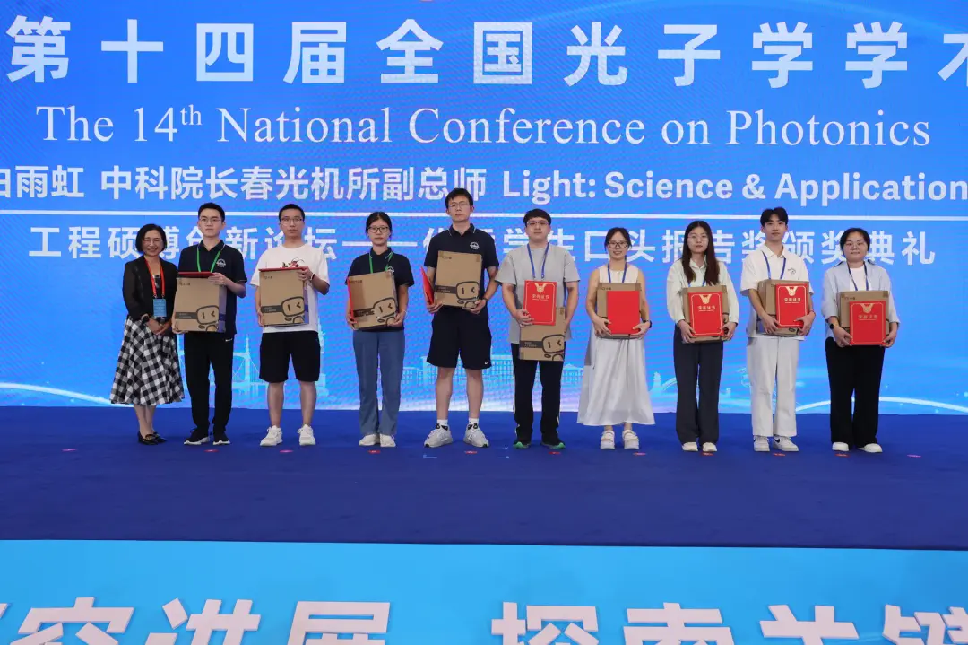 大会分论坛聚焦光纤光学与应用、集成光学与光子芯片、超快激光与瞬态光子学、微纳光子学、信息光子技术与应用、先进激光技术及应用、激光光谱技术及应用、光电信息智能处理及应用,涵盖光纤传感与通信、空间激光通信、激光技术、光电子器件、光场调控与量子光学、生物医学光学、微纳光学、超快光学等前沿方向。会议期间共进行260余场专题交流报告,并集中展示了72个张贴报告。为助力光学优秀人才茁壮成长,推动我国光学和光学工程后备队伍的培养,大会组织开展工程硕博创新论坛,并在该活动中评选出优秀学生口头报告9项,优秀学生张贴报告12项,于16日晚上举行了工程硕博创新论坛优秀学生报告的颁奖仪式,Light期刊创始人、中科院长春光机所副总师白雨虹研究员为获奖学生颁奖。